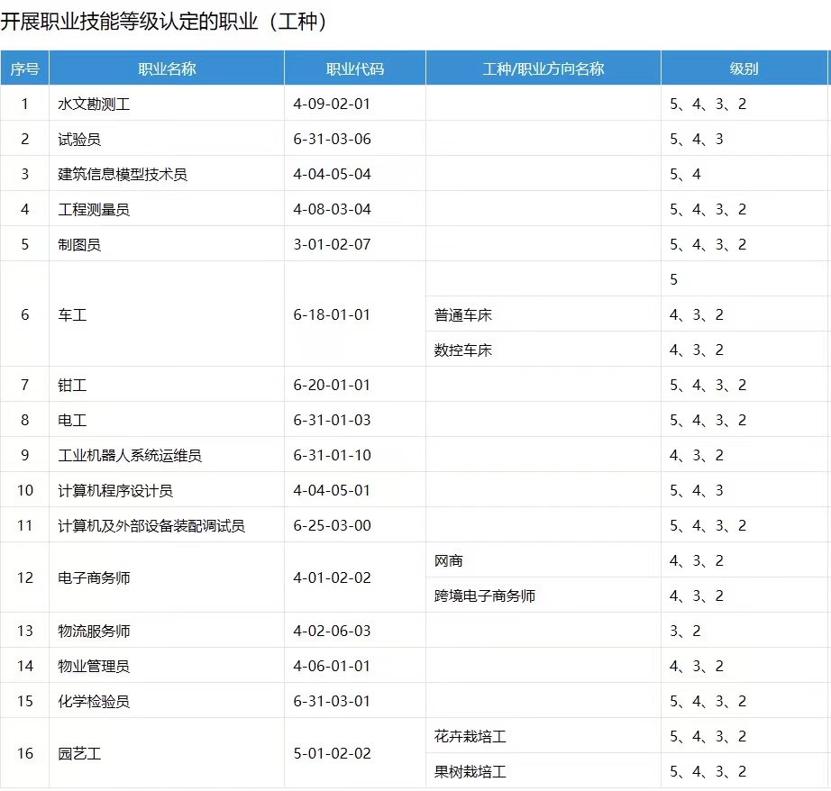我院开展职业技能等级认定的职业(工种)